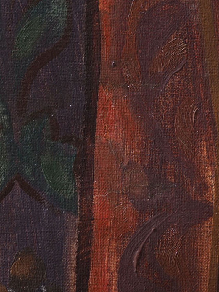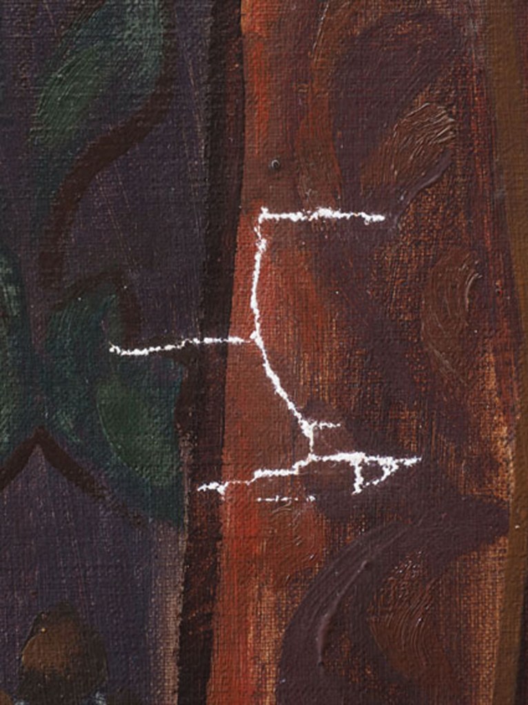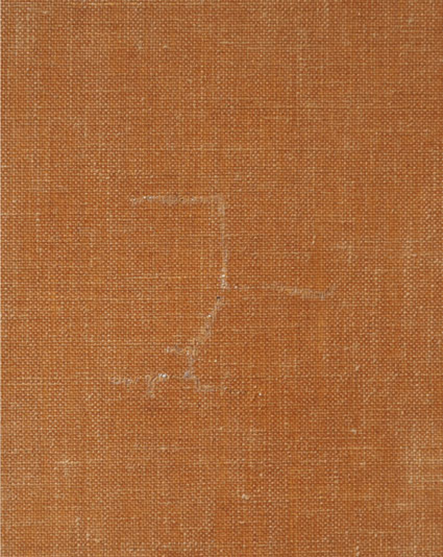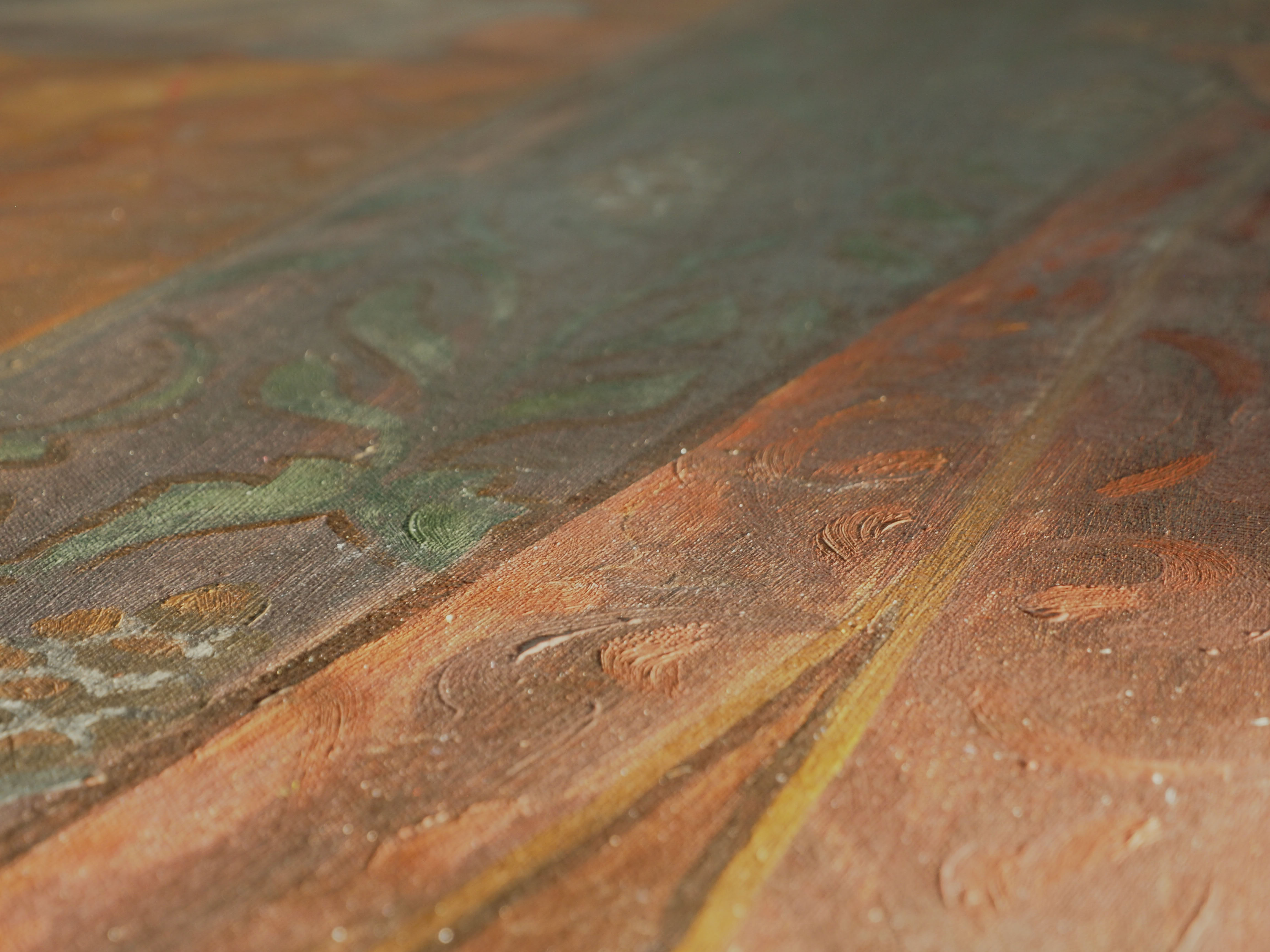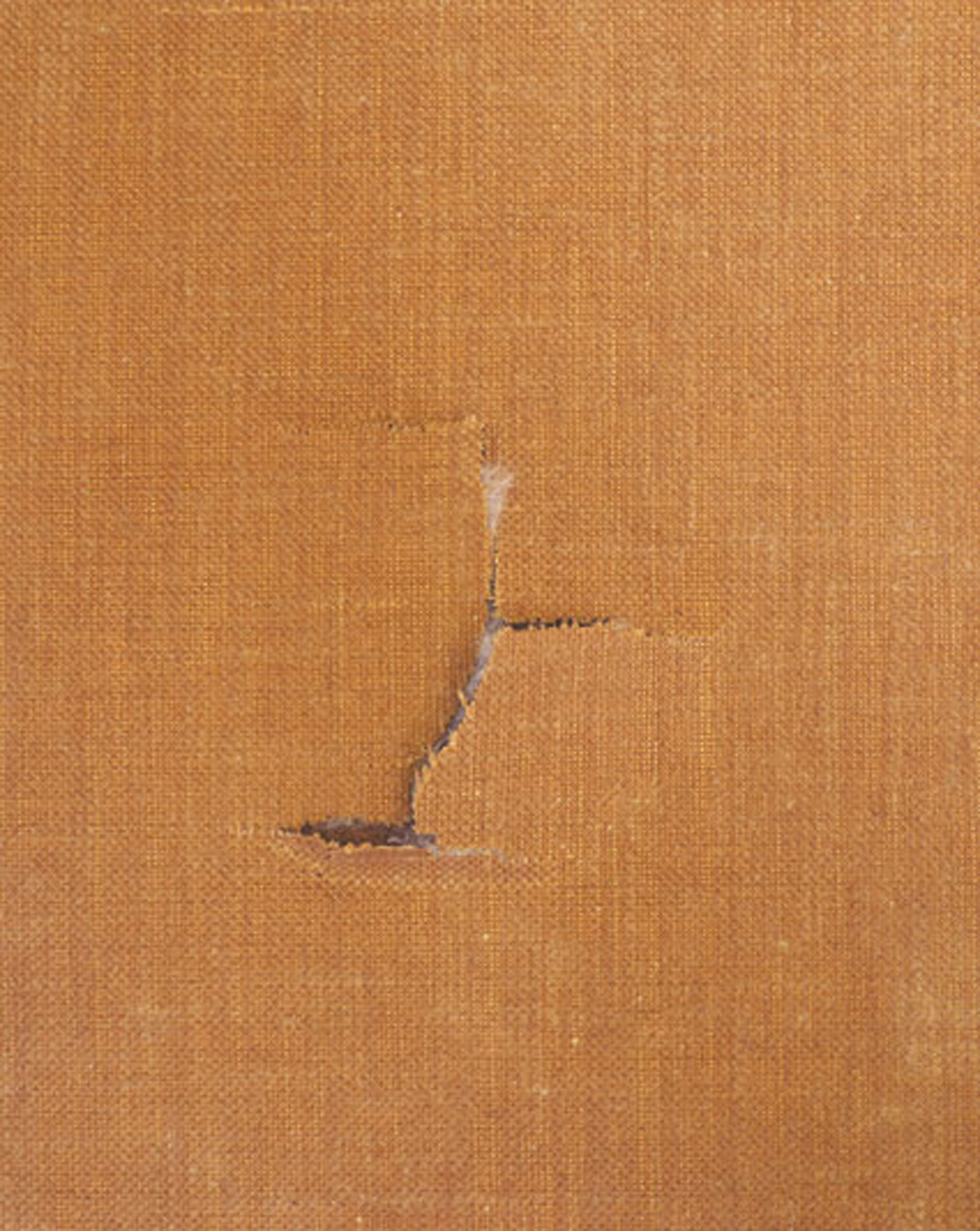 Sometimes accidents happen. In a 20th century oil painting an impact damage from the front resulted in a large and complex tear. The canvas threads were realigned and the tear mended.
