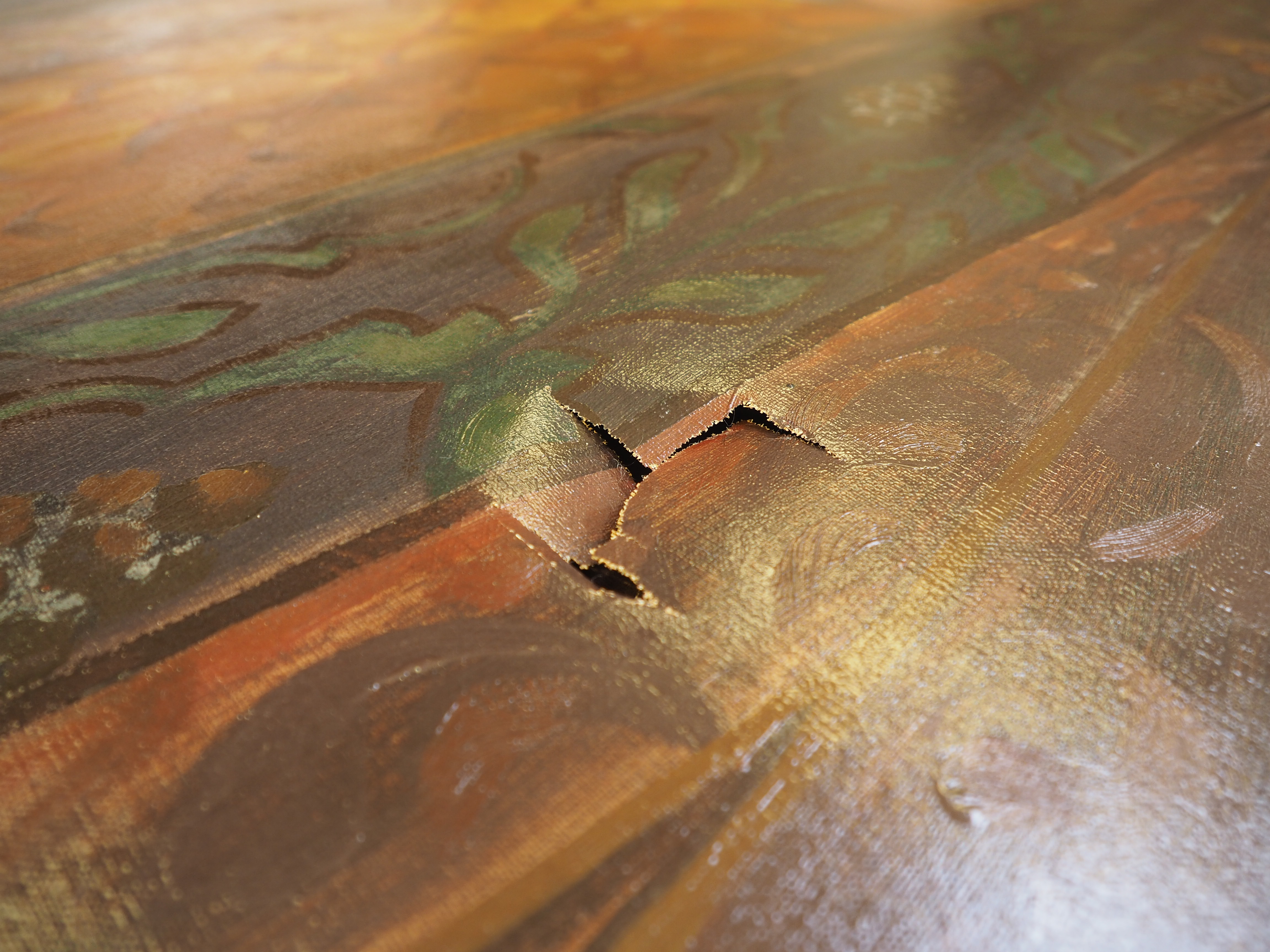 Once the tear was mended, the gaps resulting from paint loss around the tear were filled with a reversible putty and retouched in order to disguise the tear.