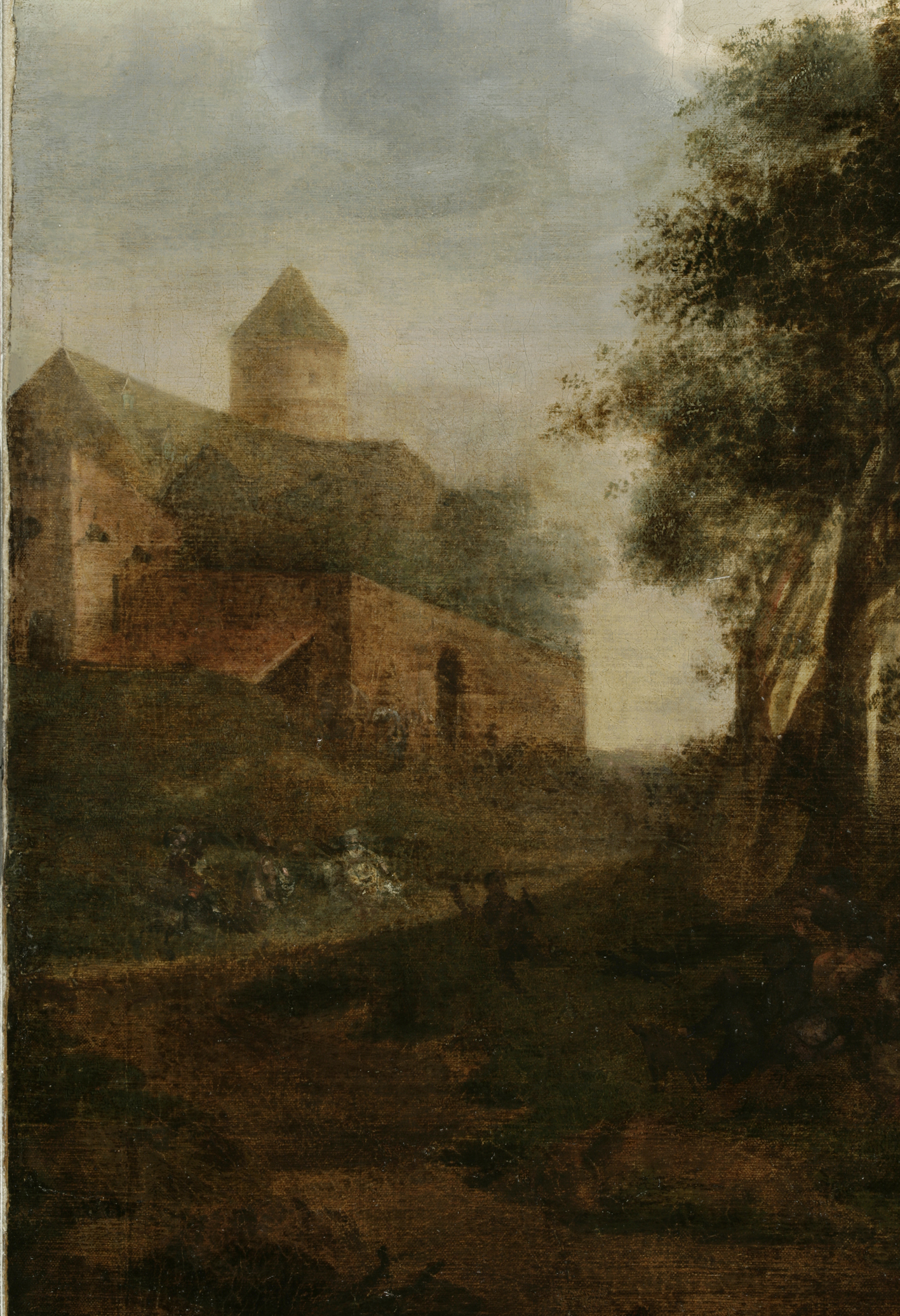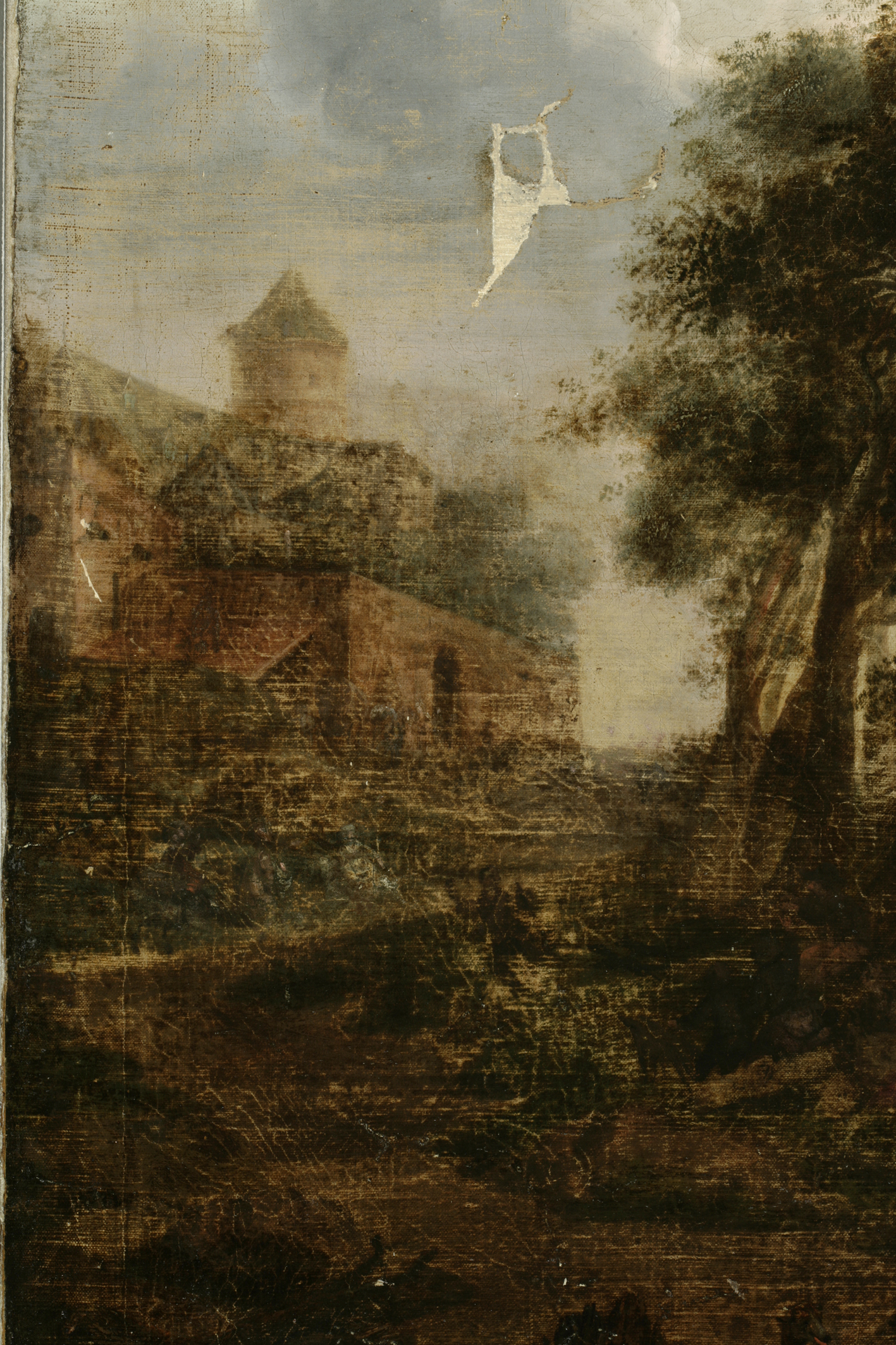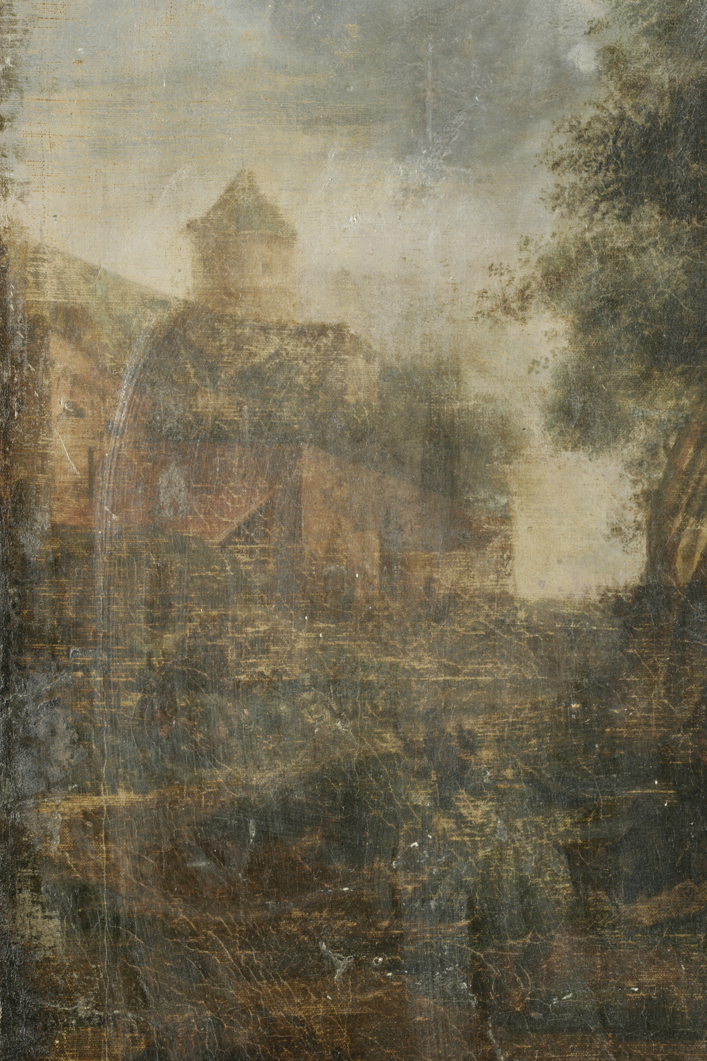 When brought to the studio, Landscape with Figures attributed to the School of Teniers was in poor condition and in need of structural and aesthetic treatment. The original canvas was beginning to peel away from its old glue-paste lining and damage and wear to the paint layers, caused from harsh cleaning by previous restorers, was also evident and needed addressing. The raking light photo of the painting before treatment shows that the painting had severe undulations that related to the condition of its canvas support. The tacking margins were so degraded that in many places the canvas was no longer attached to the stretcher.