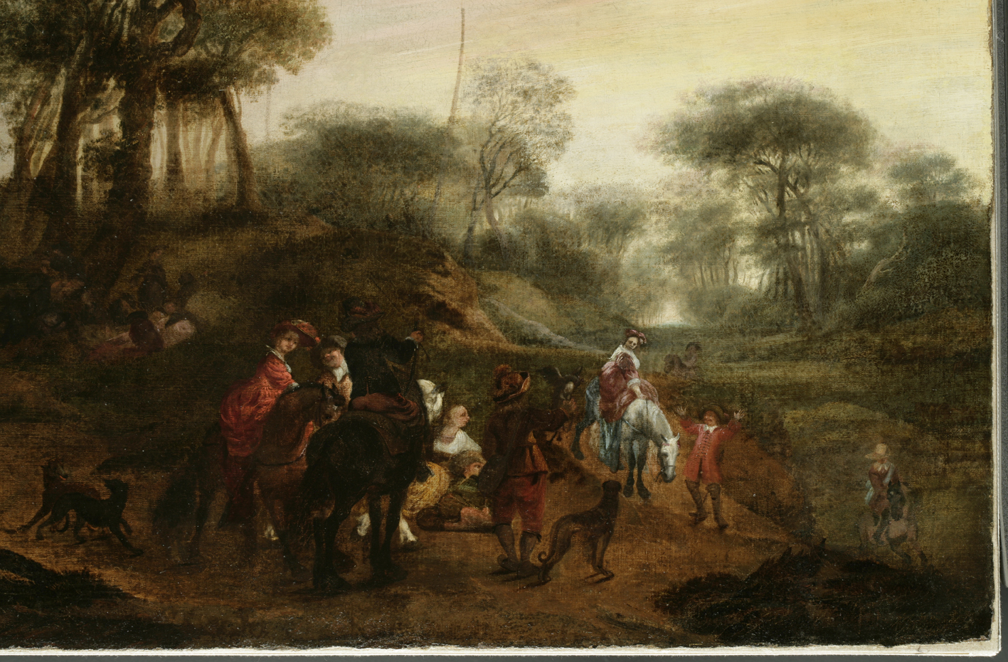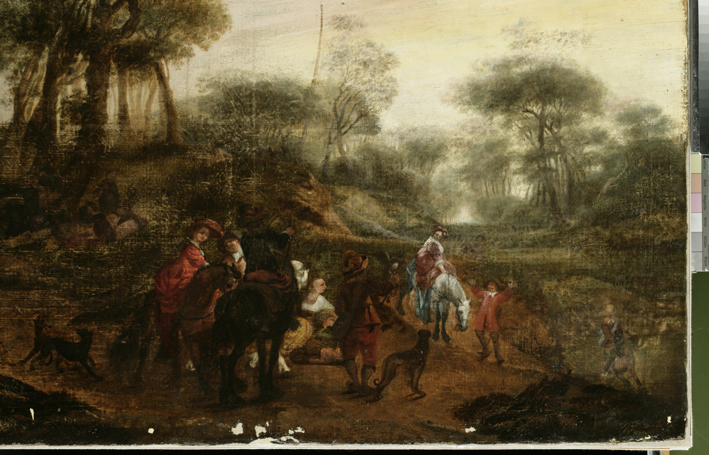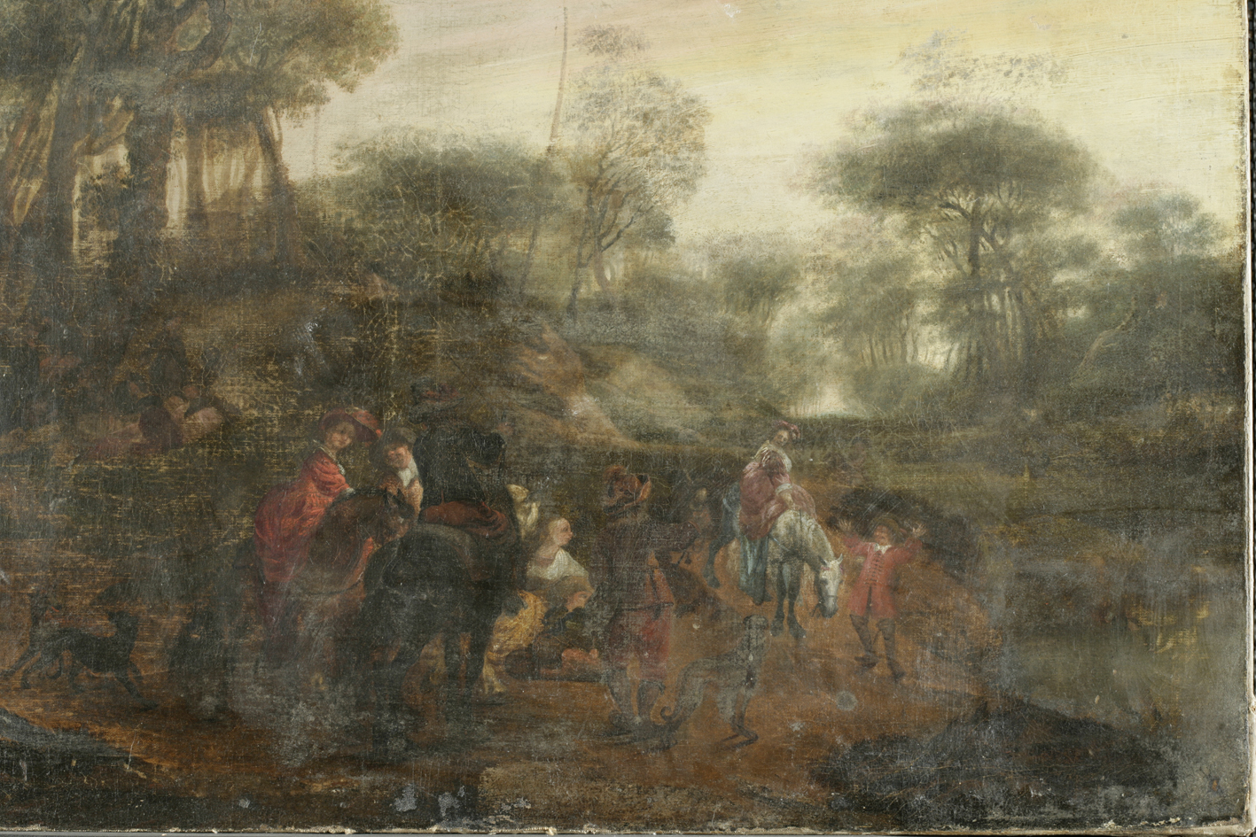The varnish present on the painting was blanched and the painting appeared unsaturated as a result. Both the varnish and overpaint was removed with solvents. Brown overpaint had been applied to mask the severely abraded paint layers and the removal of this overpaint allowed us to appreciate certain details of the painting that were previously hidden. A horse and rider were discovered in the bottom right hand corner, and the hawk, which had been visible but completely swamped by the surrounding overpaint, was suddenly part of the narrative again.