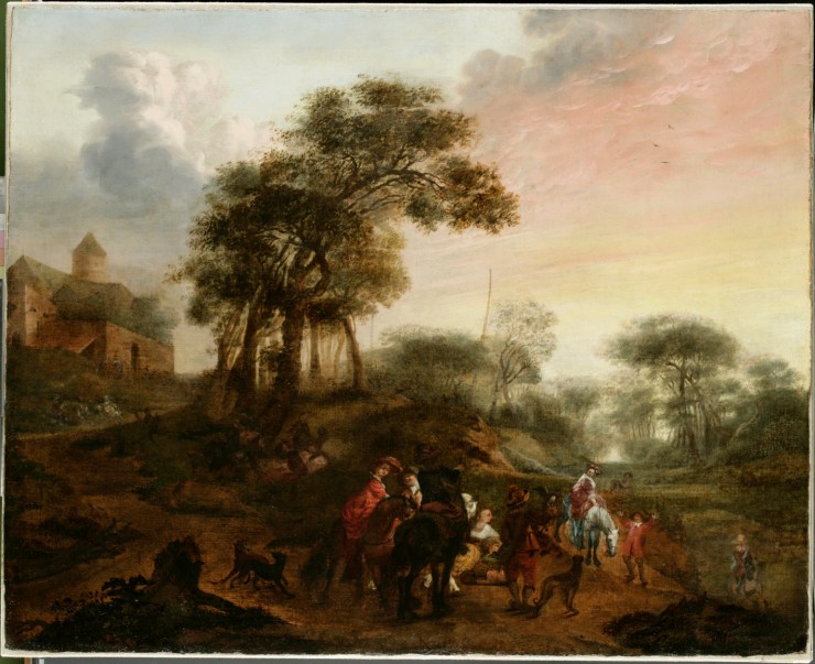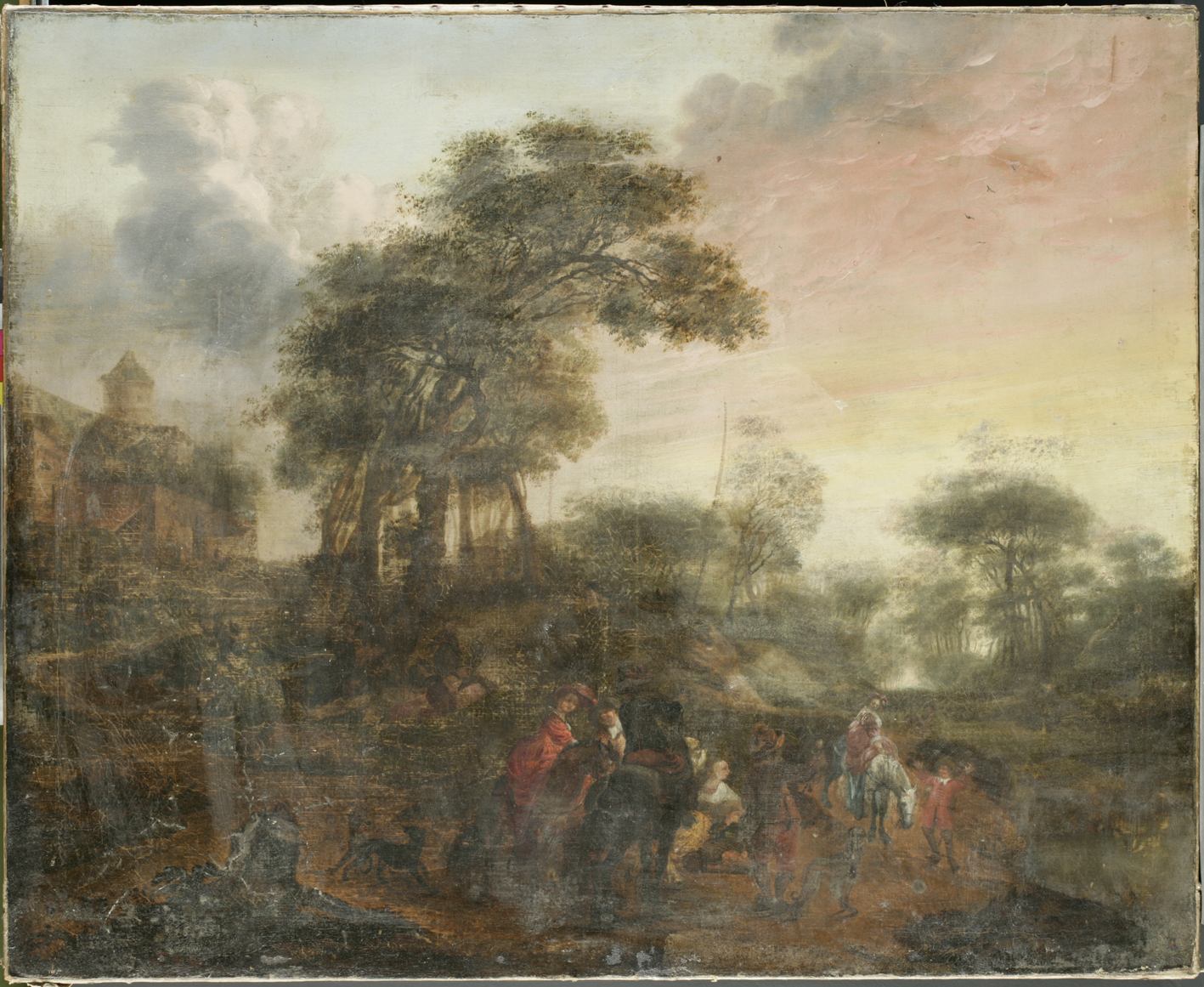 The painting was varnished and retouched using Gamblin© Conservation Colours. The wear and losses in the paint layers were retouched imitatively to a standard thought appropriate for the condition of the painting. Touching out the wear in the foreground helped to solidify the landscape and reintroduced a recession into the distance.
