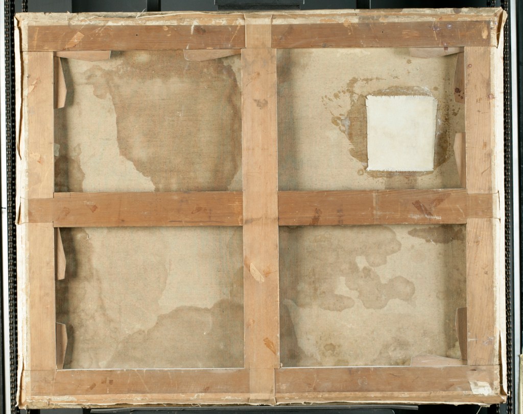 The painting was de-lined, which means the old lining canvas and lining adhesive was removed. A new, linen lining canvas was prepared and the painting was glue-paste lined and re-stretched.