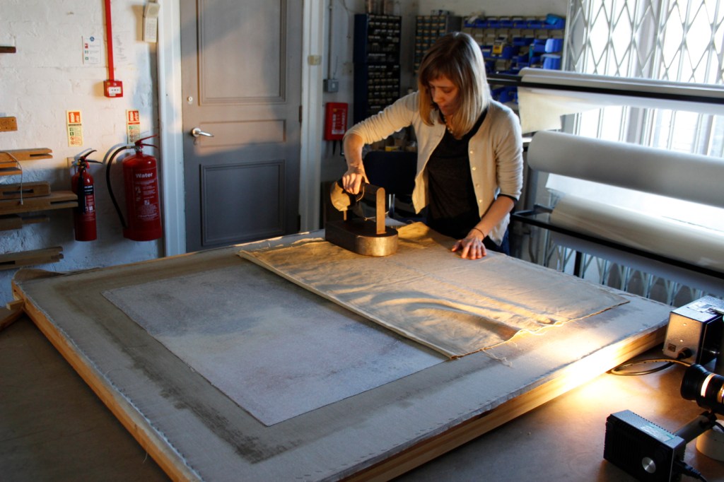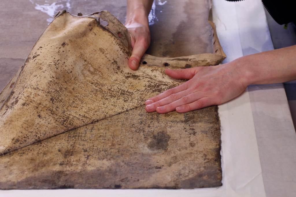 Detail showing the removal of the glue-paste adhesive (left) of the previous lining and the clean canvas (right)
