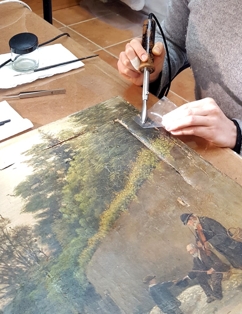 The structural stability of a painting’s support, whether it is canvas or board, is of utmost importance even though it is not always seen on the front. Untreated splits in panels, or tears and undulations in canvas paintings, can worsen over time as well being visually disturbing.